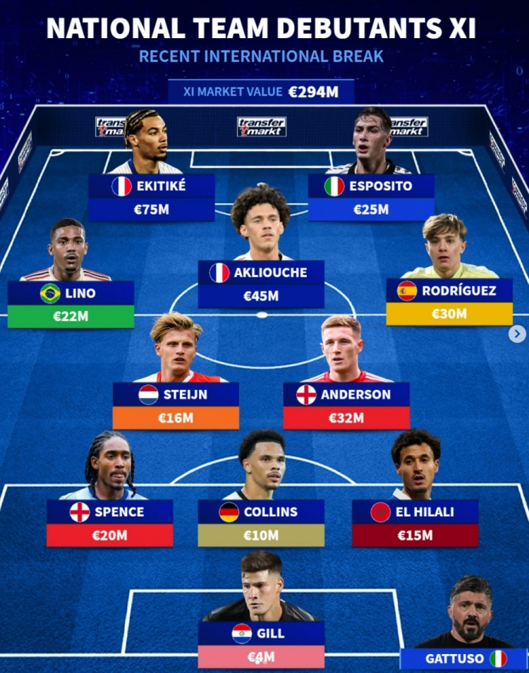 9月10日,德国转会市场网公布了一份在国际比赛周期间完成国家队首秀的11人名单,巴黎圣日耳曼前锋埃基蒂克位列其中,完整阵容如下: