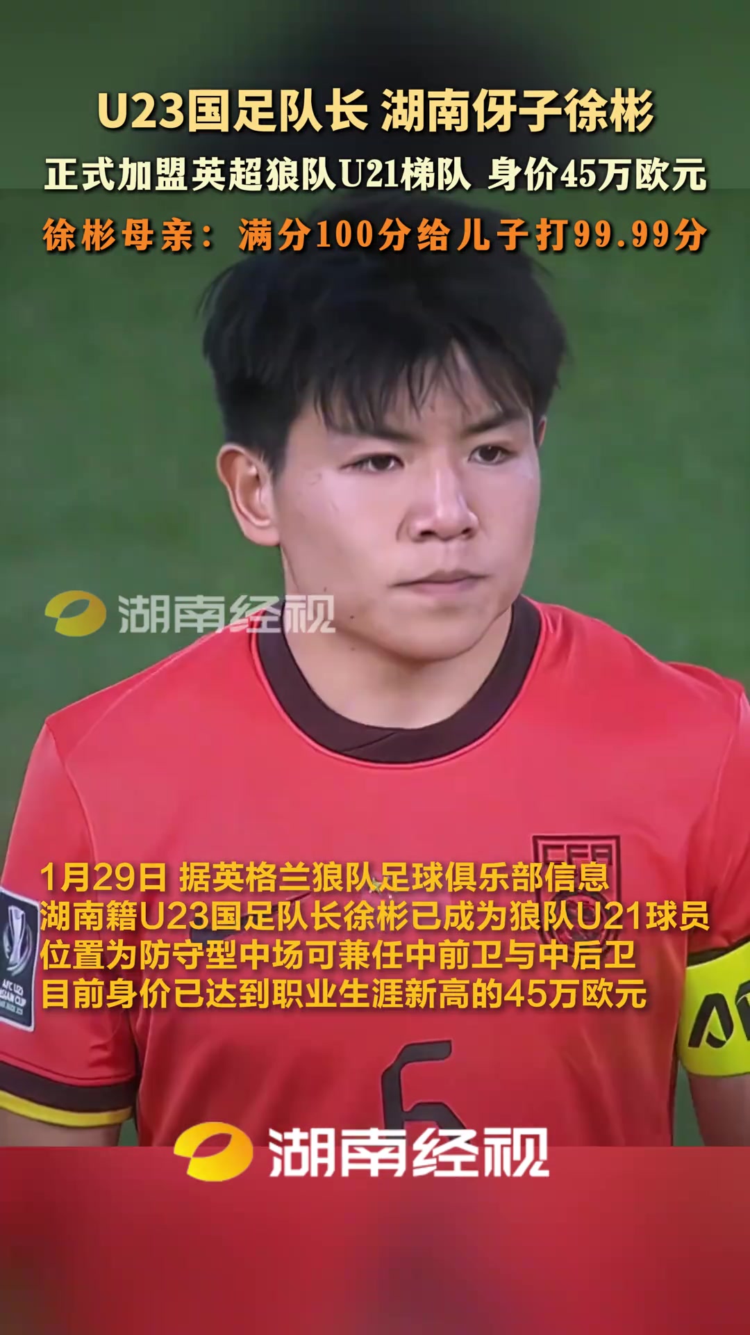 1月31日讯 狼队官方宣布签下中国球员徐彬,中国球员留洋团队再添一人。在接受“湖南财经”采访时,徐彬的妈妈给儿子打99.99分。